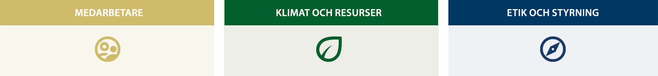 Medarbetare hanterar i första hand frågor kring vår personal medan Klimat och miljö omfattar frågeställningar kopplade till klimatpåverkan och energiförbrukning. Etik och styrning behandlar frågor kring t.ex. lagefterlevnad, affärsetik och hur vi motverkar korruption.